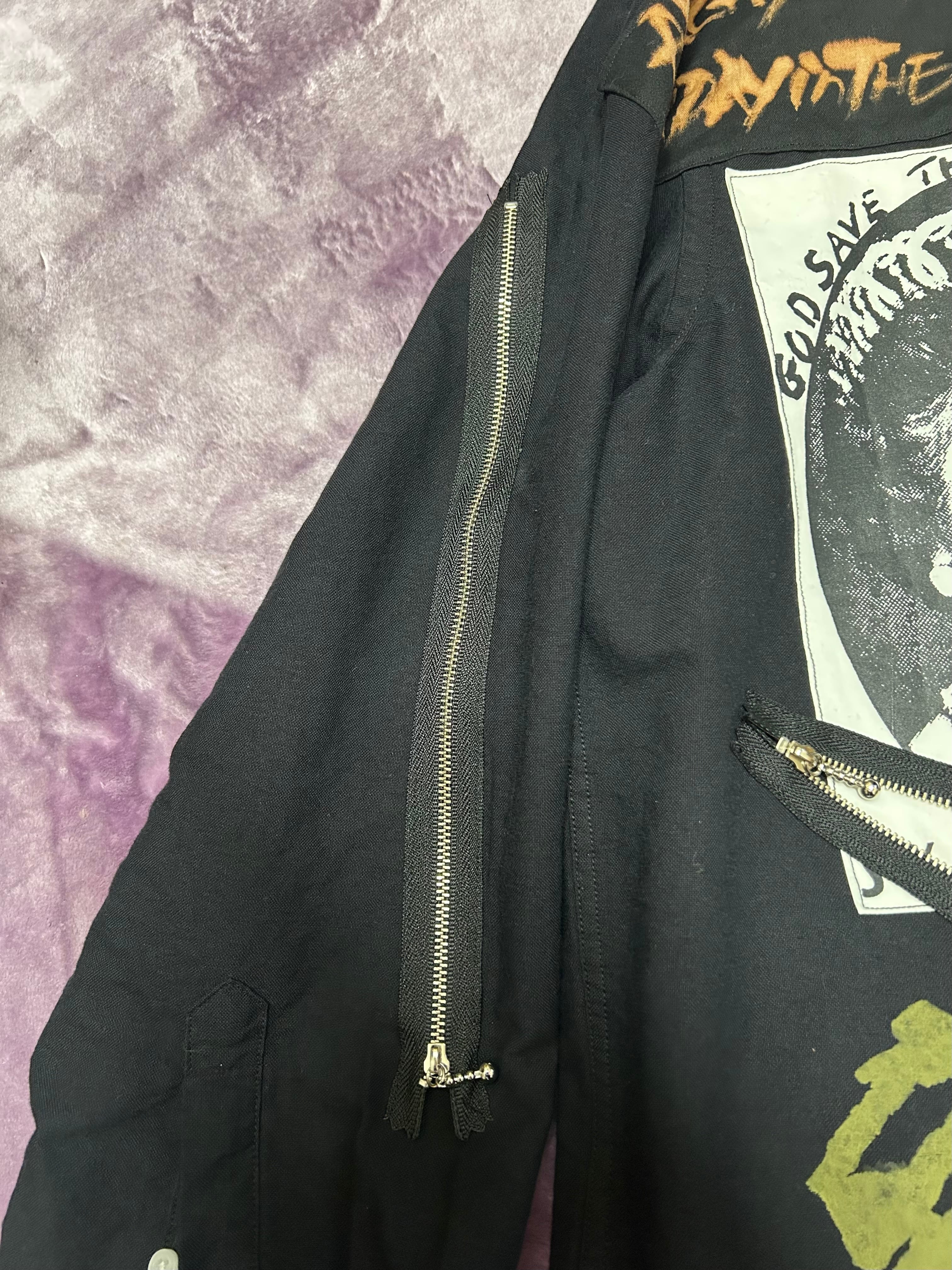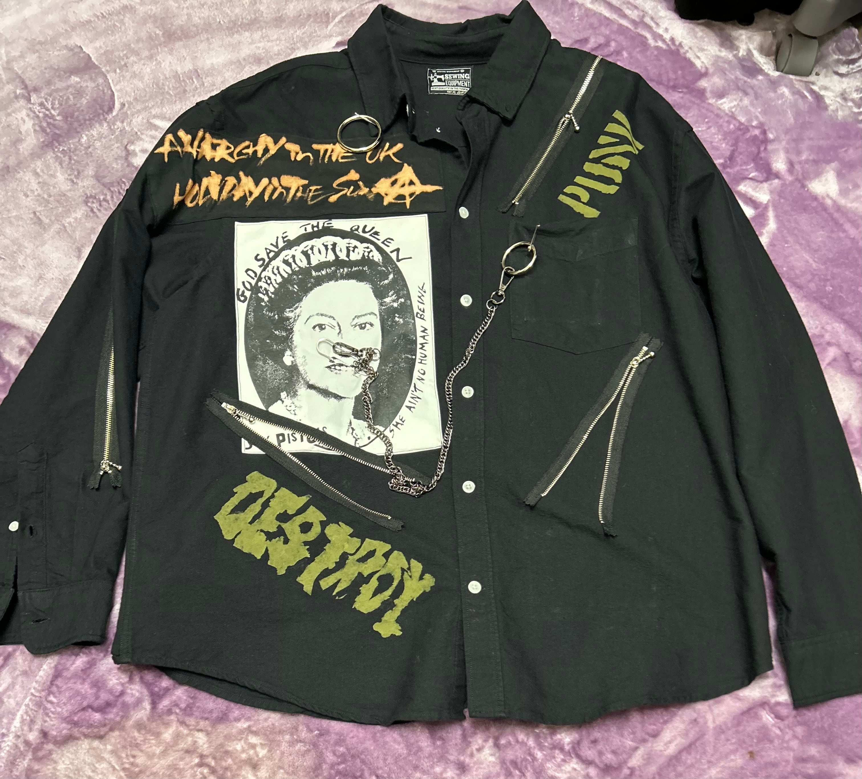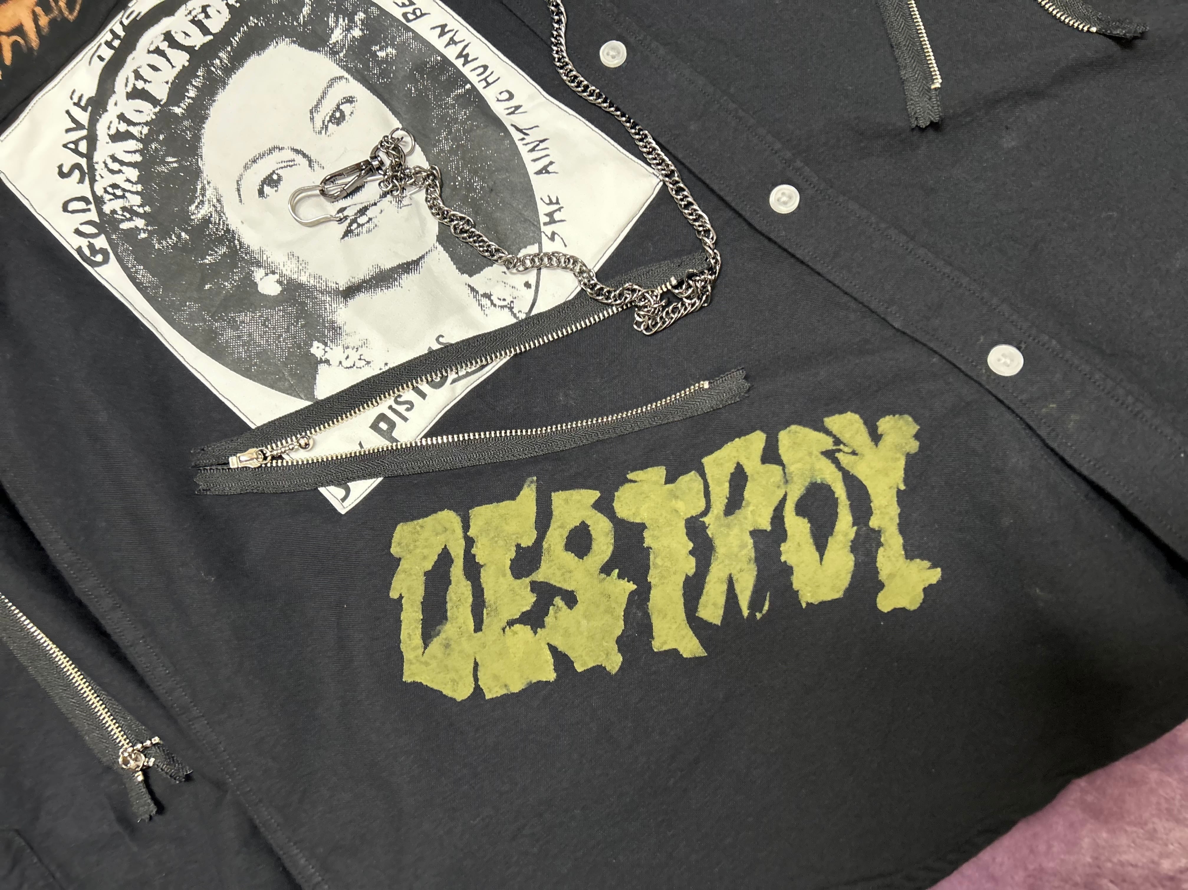 ご覧いただきありがとうございます!ハンドメイドアナーキーシャツ! このアナーキーシャツは、あなたの個性を際立たせる特別な一着です。新品のシャツにハンドメイドで施されたブリーチ加工と、手作業で丁寧に取り付けたチャックが特徴です。